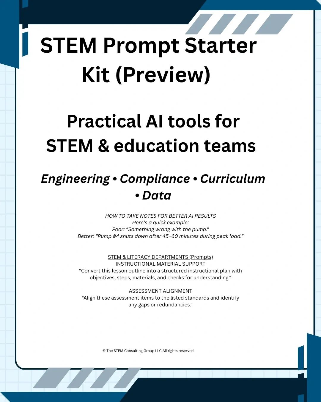 We help STEM and education teams modernize their workflows with practical, responsible AI without sacrificing clarity, accuracy, or technical rigor. Our experience spans engineering, curriculum design, compliance, data literacy, and STEM program development.